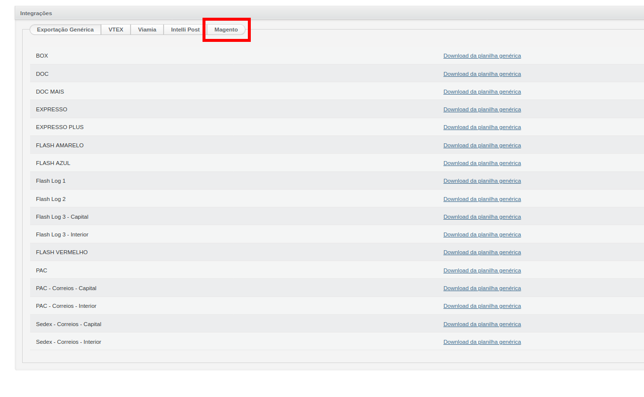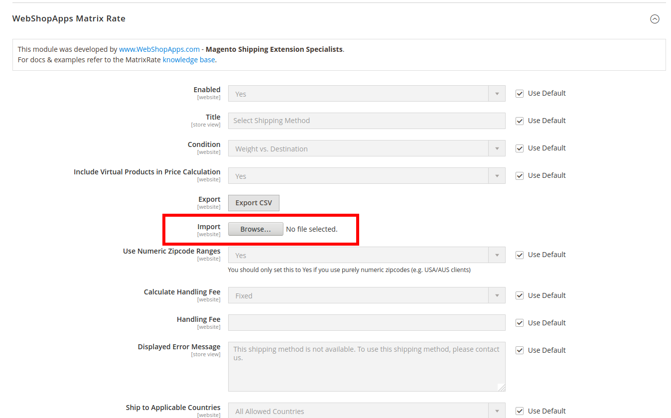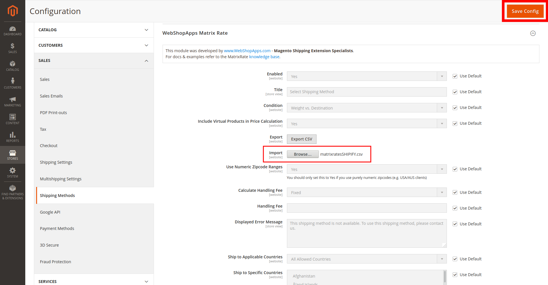 Com a tabela exportada, podemos importá-la no MatrixRate/Magento