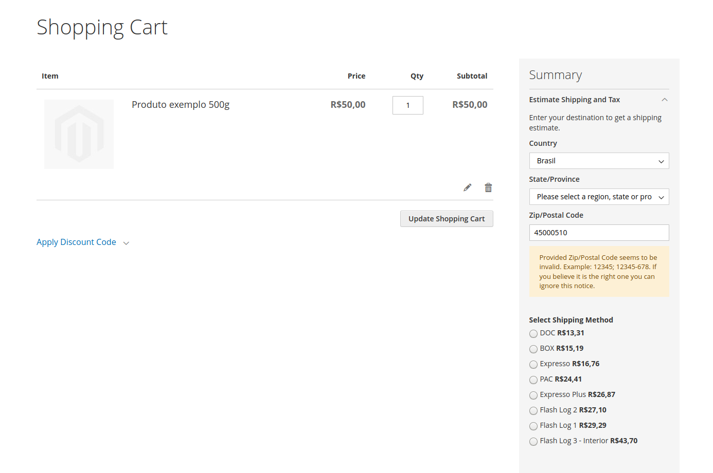 10 - Após a importação, os produtos Flash Courrier estarão disponíveis no carrinho para seleção: